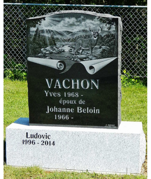 Un monument de granit noir illustrant un magnifique paysage de la nature et dun cerf. Notez que limage gravée peut être modifiée selon vos goûts.
